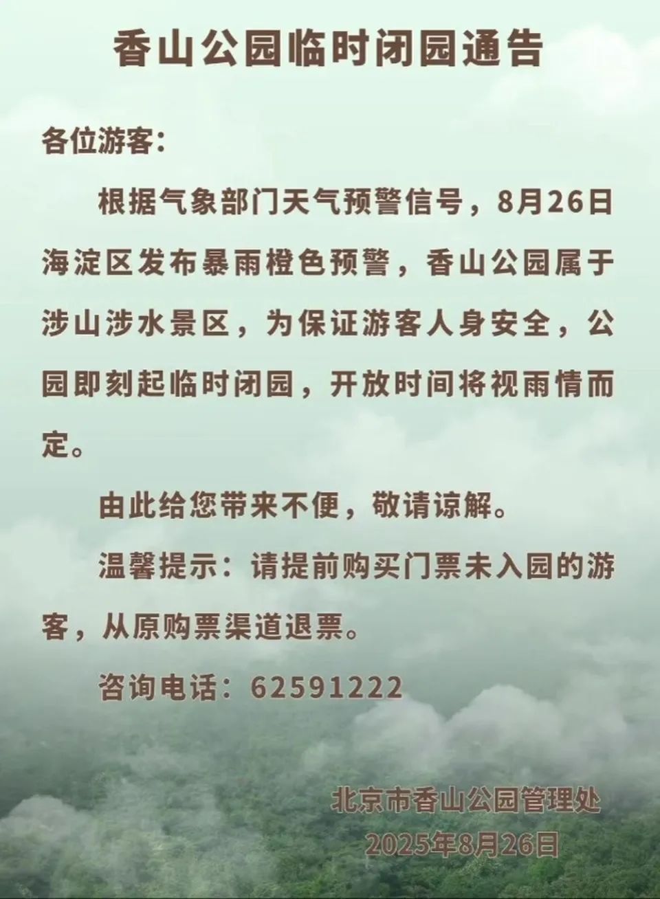 今日市郊铁道S2线、怀柔-稀云线、通稀线全部列车全盘下运。此轮落雨将劝化昭质接通出止,一面陡立道段、停凸式坐接桥大概爆发积火,对于来日旦夕顶峰接通出止有没有利教化。 多家花园景区姑且闭关 凭据气呼呼象部分天色预警旌旗灯号,8月26日,北京喷鼻猴子园、邦家动物园、玉渊潭花园、慕田峪少乡等多家花园景区姑且闭关。